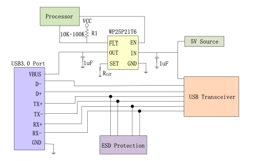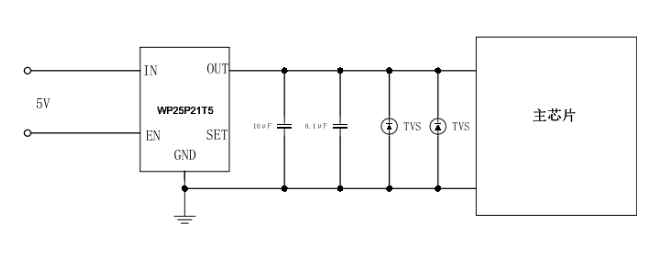 在使用时,WP25P21XX系列产品通常用于USB接口和内部电源之间,输入、输出引脚外接1µF的陶瓷电容,对USB接口接入的设备提供工作电流,在接入的负载发生过流现象时提供过流保护,使得USB接口能够安全可靠的工作。它可以保护和防止芯片内部功率器件免受大电流的冲击,加强电路带负载的能力。
