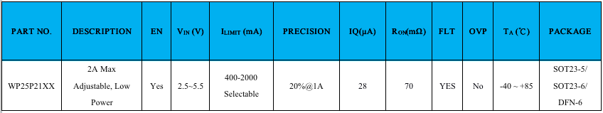 维安(WAYON)WP25P21XX系列产品输入电压为2.5V~5.5V,可调电流限制范围在0.4A~2A之间,导通电阻70mΩ,28μA的静态功耗,主要封装形式为SOT23-5/6和DFN-6封装,可以满足小空间、低功耗产品的应用场景。