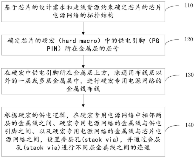 参考图1,该专利提出的提升硬宏供电可靠性的方法主要包括4个步骤,首先基于芯片的设计需求和走线资源约束确定芯片电源网络的拓扑结构(步骤110),包括金属层数、通用布线层数、等。紧接着确定芯片硬宏中的供电引脚所在金属层的层号(步骤120)。