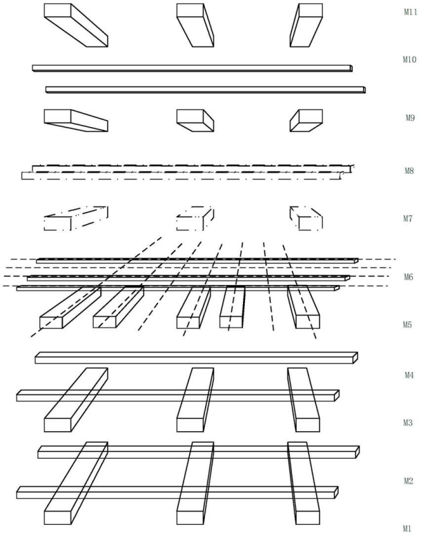 图2是本专利提出的一种芯片电源网络拓扑结构图,展示了一个具体的提升芯片硬宏供电可靠性的方法过程示意图。首先从M1到M11的金属线依次沿纵向、横向、纵向、横向…… 方向排布。选定金属层M5、M6用于硬宏专用电源网络的金属线布线,走线轨道如图中虚直线所示,选择其中两条走线轨道用于金属线布线。图中清晰展示了布线后的M5、M6上的金属线长方形框体,而M7、M8在硬宏对应位置上没有金属线。
