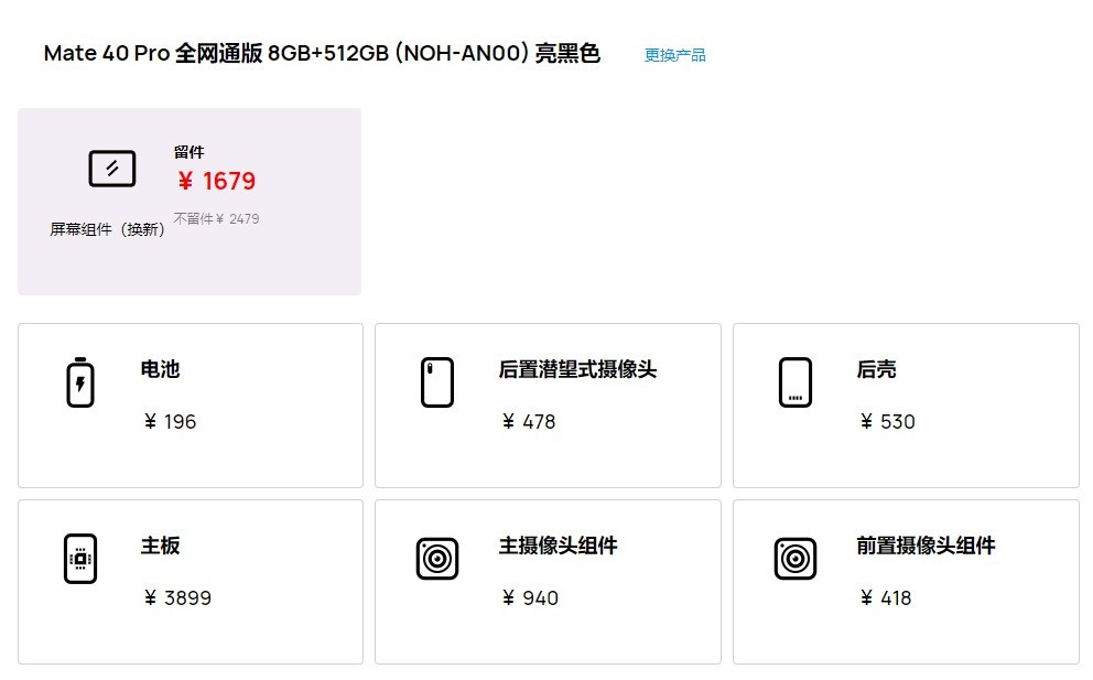 从图片中的各个部件的维修价格能够看出,最贵的是屏幕和主板,其中屏幕组件最低也要 1679 元,主板最低需要 3199 元,Mate40 RS 40 保时捷设计的主板更是达到了 6699 到 7699 元,因此用户平时要注意保护好屏幕和主板,建议戴保护壳同时避免让手机进水。