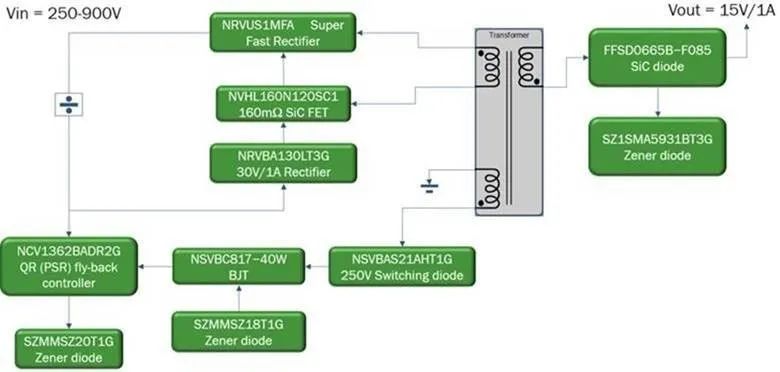 该方案利用 NCV1362 准谐振峰值电流 PSR 反激控制器、成本优化的 NVHL160N120SC1 160mΩ1200 V 碳化硅(SiC) MOSFET 和 FFSD0665B-F085 SiC 二极管的多种优点。