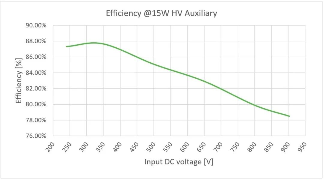 得益于 SiC FET 的高阻断电压能力和超低门极电荷(34 nC)值,开关损耗显著减小,该设计表现出出色的能效,在低交流电条件下高达 86%。
