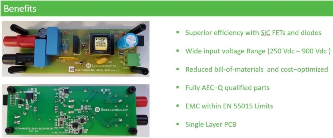 使用相同 NCV3064 的另一个 SiC 变体 SECO-LVDCDC3064-SIC-GEVB 将适用于 SiC MOSFET 开关,为门极驱动器提供+ 20 V /-5V 电压轨。