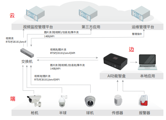而基于 AI 功能智盒,通过下接各种监控摄像头、传感器,上接视频监控平台、运维管理平台以及第三方应用,则实现了“端+边+云”的架构模式的落地,使得实时、动态、互动、融合的数据采集、分析能力可以被赋能于各种场景。