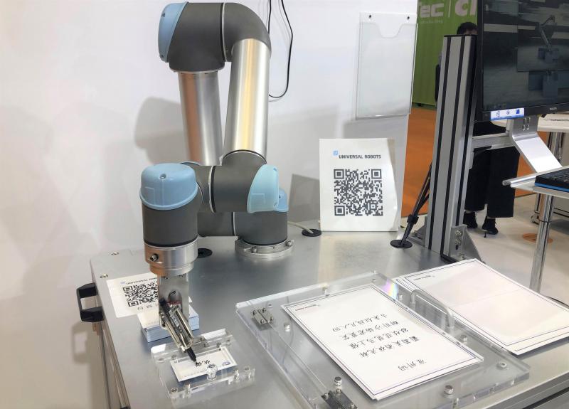 UR 写字机器人使用了最新的 AI 图像识别技术,对各类字体的字型、笔画进行了拆解分析,计算出最优化的书写路径。再结合 UR 协作机器人灵活、精准、安全性高的特点,完成整个柔性书写过程。这套方案在教育、笔类检测、AI 创作等领域有广泛的应用前景。