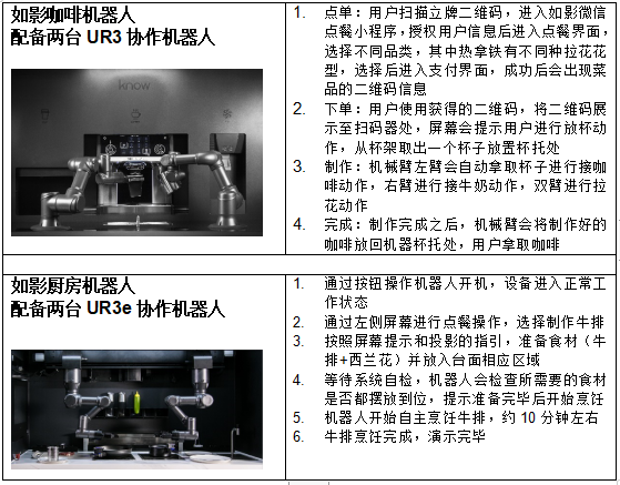 北京如影智能科技有限公司(Know,以下简称为如影智能)是 UR 战略合作伙伴。目前,如影智能发布了两款机械臂应用产品:如影咖啡机器人和厨房机器人,分别配备了 UR3 和 UR3e 协作机器人。