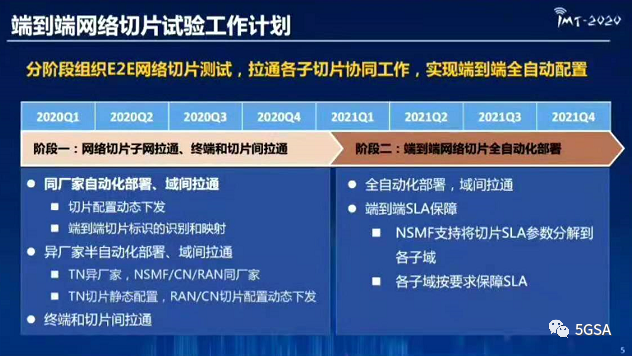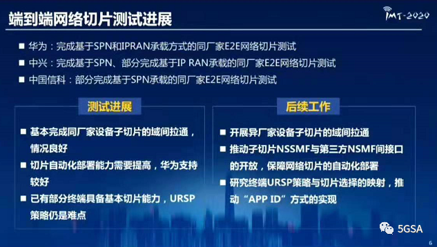 我们(IMT-2020)推进组也是跟CCSA同步,基于CCSA制定的总体技术要求,制定了切片的测试方法。同时,推进组的承载组,也做了包括端到端网络切片的一些对接标识,映射管理和SLA保障方面的工作。