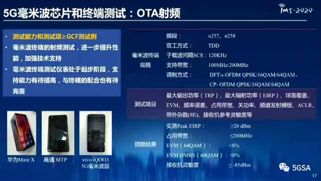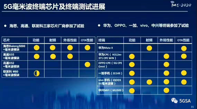 毫米波在终端芯片方面,海思、高通和联发科的三家芯片都参加了我们的一个实验。部分厂家大概有两款这种芯片,主要是时间点非常紧,大家先有一款芯片已经成熟就先来测,然后后续再接着一款一款再来逐步进行测试。