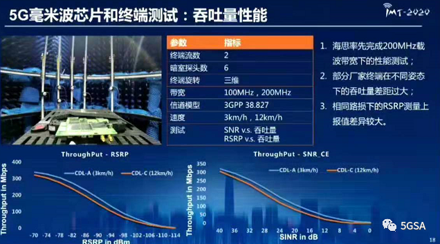 前面是说我们对于基站侧做了性能测试,同时对终端侧也做了测试,也是在3GPP模型之下。这两个图可以看到,终端是手握的,会有一定的阻挡,所以在测试中发现,终端在不同的姿态下,吞吐量差距还是比较大的。