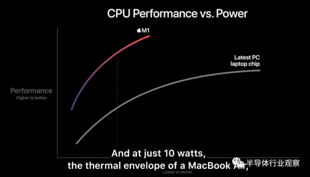 M1可以在10W功耗下提供两倍于最新笔记本芯片的性能,能效比则高达三倍。