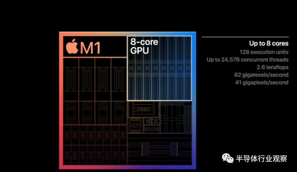 在GPU方面,同样采用8核心设计,包括128个执行单元,支持最多24576个并发线程,浮点性能高达2.6TFlops。苹果依旧是在平衡性能与功耗,并表示一般集成显卡无法达到如此平衡效果。号称M1拥有世界上最快的集成GPU,10W功耗下性能是最新笔记本芯片的两倍。