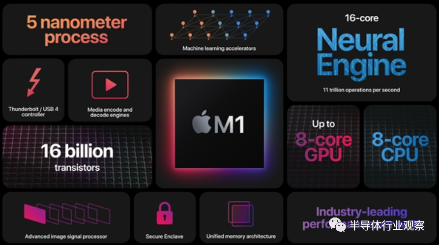 M1是首款5nm电脑芯片,内含160亿颗晶体管。在CPU方面,苹果称每个核都被设计为在保证最大化性能的同时,尽可能高效运行单个任务或者线程。