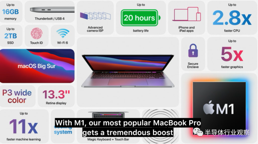 此外,M1集成了16个核心的神经引擎,实现每秒11万亿次操作。还拥有新的硬件加密和生物识别特性,支持雷电和USB-4端口、Secure Enclave安全模块、机器学习加速器、高质量ISP等。