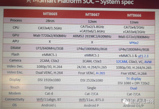 联发科下一步主打产品是MT8666,已经有不少前装车厂正在导入,预计2021年或2022年将大放异彩。与联发科标准车规级MT2712比,MT8666要强很多,MT2712是四核ARM Cortex-A35@1.3GHz处理器和两核Cortex-A72@1.6GHz处理器,GPU是Mali-T880 MP4。MT8666强MT2712太多。MT8667则降低了性能,功耗更低,可能为了更接近标准车规。MT8666就是主打高性能。支持VOS虚拟机,三屏显示,仪表、中控和副驾,中控和副驾支持触控,有3路4 Lane MIPI CSI,也就是最大12个100万像素摄像头输入。也支持UFS快速启动。