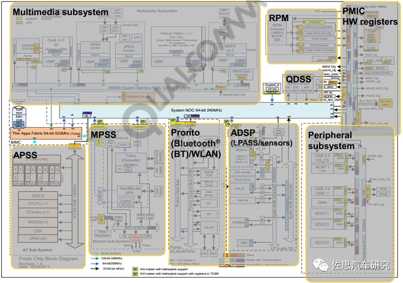 高通骁龙625内部包括:APPS,Cortex A53 core,运行android;RPM(Resource PowerManager),CortexM3 core,主要用于低功耗应用;Modem(MSS_QDSP6),高通自有指令集处理器,处理3G、4G通信协议等;Pronto(WCNSS) ,处理wifi相关代码;LPASS,音频相关。