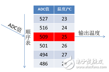 因为涉及到复杂的对数运算,对于低成本精度要求不高的场景,采用实验测量标定生成温度与ADC采样值的对应表格,查表法更适合。首先用温控设备,标定出温度与ADC采样值的表。由测量电路结构可知,ADC采样值与当前温度成反比关系,因此测出的数据表为顺序表,可采用顺序查表算法。