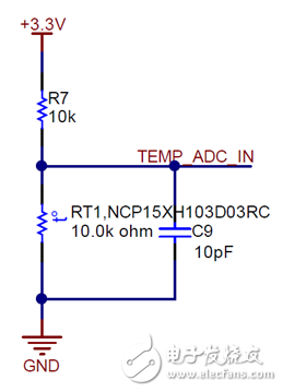 NTC是具有负温度系数热敏电阻,其电阻值随温度上升而下降,可用来作为温度传感器。考虑到散热系统对温度测量精度要求相对不高,系统采用NTC测量温度的方案,以MSP430的片上ADC作为转换,具有低成本的优势。电阻值随温度有如下关系