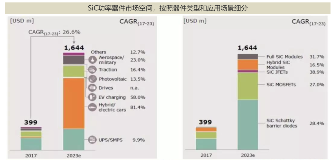 具体来说,碳化硅材料的热导率更高,在高功率、高温和 1200V 以上的大电力领域中具备更大的应用潜力,比如智能电网、交通、新能源汽车、光伏、风电等领域;