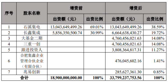 据悉,睿力集成成立于2016年,注册资金189亿元,是一家主要从事集成电路及相关产品的生产、研发、设计、销售等业务的公司。本次增资前后,睿力集成的股权结构如下: