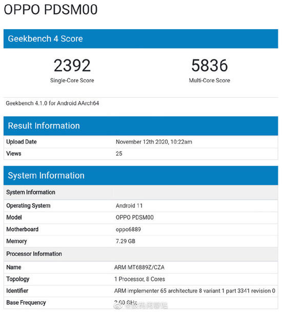 据介绍,这款手机的型号是OPPO PDSM00,与此前出现在工信部的机型型号吻合,应该是Rena5系列的机型。这款手机在Geekbench网站的测试得分分别是,单核2392分,多核5836分。该博主介绍,这款手机的处理器是天玑1000+处理器。有一点值得注意,他表示这款手机的跑分较低,可能是因为工程机锁频的原因。