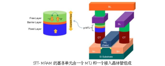 MRAM中的数据是由磁存储元件存储。这些元素是由两块铁磁板组成的,两块铁磁板之间隔着一层薄薄的绝缘层,每一块铁磁板都能保持磁化。这种结构被称为磁隧道结(MTJ)。两块极板中的一块是在制造期间被设置为特定极性的永磁体;另一块板的磁化率可以随存储的数据进行改变。瑞萨电子最近增加了MRAM器件,该器件使用了一种基于垂直磁隧道结(p-MTJ)的专有自旋转移扭矩MRAM (STT-MRAM)。p-MTJ包括固定且不可改变的磁层、电介质阻挡层和可改变的铁磁存储层。
