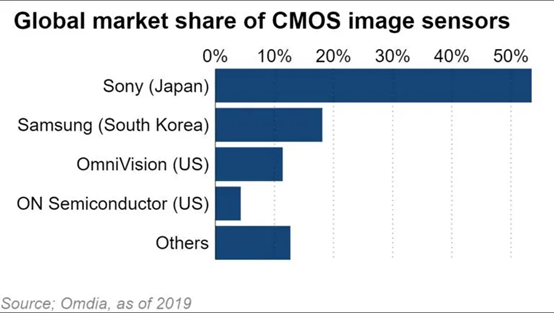 根据英国研究公司Omdia的数据,凭借CMOS图像传感器,索尼在2019年的全球市场价值中占据了53.5%的份额,紧随其后的是三星,市场份额为18.1%。