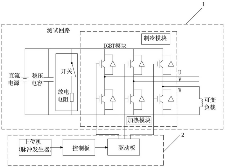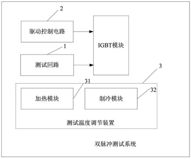 如图1所示,该发明专利提出的汽车用IGBT模块的双脉冲测试系统包括测试回路1、驱动控制电路2、测试温度调节装置3以及被测的IGBT模块,其中测试温度调节装置包括加热模块31和制冷模块32,可分别用于高温和低温测试。当对IGBT模块进行测试时,测试回路1提供可调电压和电流,驱动控制电路提供测试脉冲,通过测试温度调节装置3使得被试IGBT模块温度升高或降低,从而分别对IGBT模块在高温、低温以及极端温度工况时进行双脉冲测试,保证汽车级IGBT在各类温度环境下的性能可靠性,整个测试操作过程简单高效。