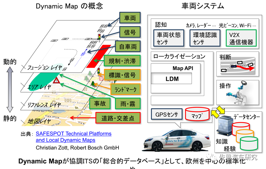 本田或者说日系的自动驾驶都会沿着这条路走下去,就是高精度地图与 V2X 融合。这里就需要提到日本 DMP 公司,日本在 2016 年 6 月成立了 DynamicMap Planning 公司,该公司股东包括日本 10 大汽车公司,三菱电机和地图开发商 Zerin。其中核心技术源自三菱电机的 MMS(Mobile MappingSystem)。日本 DMP 公司将静态信息模型分成动态、准动态、静态、准静态等四层 LDM 模型,并且想把这个格式推向全世界。