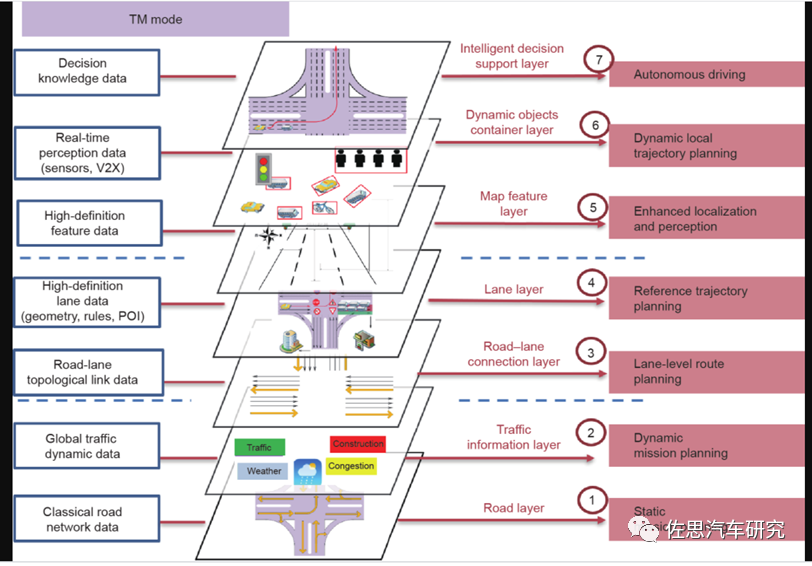 不过民营企业似乎对此缺乏兴趣,比亚迪、吉利、长城没有加入。 国汽智联规划有五大共性交叉以及产业化支撑平台,分别是:智能网联计算基础平台,智能网联车载终端基础平台,智能网联汽车云控基础平台,高精度动态地图基础平台,信息安全基础平台。其中高精度动态地图基础平台影响力最强,近似于日本的 DMP,其任务包括整合行业内的资源,制定高精地图的数据标准,研发高精地图采集与加工的基础关键共性技术,开展全国范围内的高精地图大规模快速的采集。 在日本 4 层 LDM 的基础上,中国提出 7 层模型。