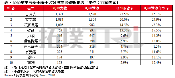 2020年11月17日 | 全球Q3前十大封测厂营收增加到67.59亿美元