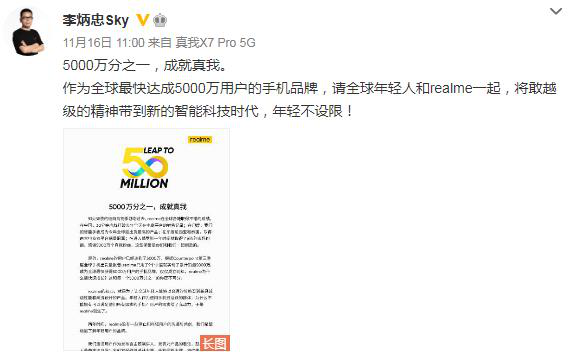 集微网11月17日消息,昨天realme CEO、创始人李炳忠发表长文宣布realme成为全球最快达成5000万用户的手机品牌。