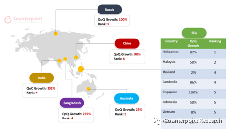 从realme的主要市场来看,2020年第3季度,realme在印度市场的出货量环比大增300%。东南亚市场,realme同比增长196%,环比增长47%。在菲律宾、马来西亚、印度尼西亚、泰国和越南等国家稳居Top 5。realme并成功进入俄罗斯、澳大利亚、新加坡等市场的Top 5。