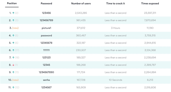 排名靠前的几个密码,相信大多数人都非常熟悉,123456、123456789、password、12345678、111111、123123、12345、1234567890、1234567、qwerty、000000、1234……看来全球用户都“青睐”数字。而这些密码的破解都不需要1秒钟。
