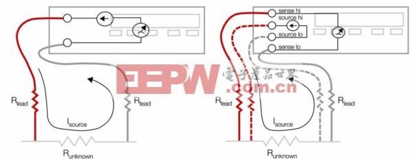 图2(右). 4线电阻测量消除了电压引线中的电流,消灭了这一误差来源。