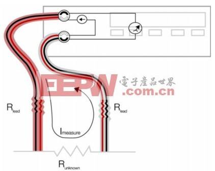 在测量电阻时,万用表会把电流源切换到测量环路中。电流被驱动通过未知电阻,万用表测量得到的电压下跌。如果只有两条引线,如图1所示,源电流流经的路径与测量电压下跌的路径相同。测量引线并不是完美的导体,自己有一定的串联电阻。通过驱动电流通过测量引线,您不仅可以看到未知电阻中的电压下跌,还可以看到每条引线的电压下跌。因此,您测得的是正引线、未知电阻和负引线的综合电阻。