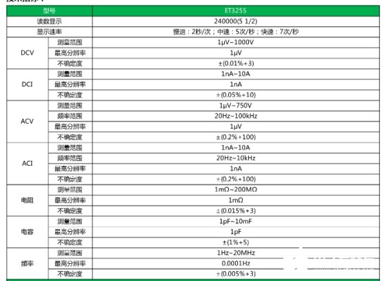 ET3255 是五位半(220000 计数)双数显台式真有效值数字万用表。本系列台表采用 STM32 芯片配合外部双积分 AD,提供精准的测量,稳定的性能。3.5 寸 320*480 高分辨率 TFT 液晶显示屏读数清晰、显示丰富,具有良好的视觉效果。本系列台表采用市电供电,并提供全功能、全量程过载保护。清新、简约的外观设计配合出色的性能使之成为电工、电子爱好者、工程师及高等院校实验室的必备之选。
