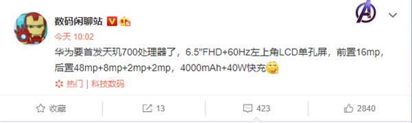2020年11月23日 | 华为新机:或将首发天玑700芯 支持40W快充