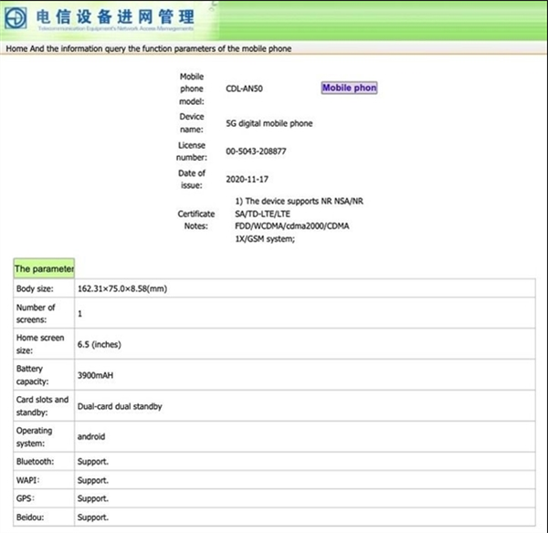 据了解,这部型号CDL-AN50的手机采用6.5英寸显示屏,内置3900mAh电池,支持40W快充,目前关于该机的详细参数与照片工信部还未公开。