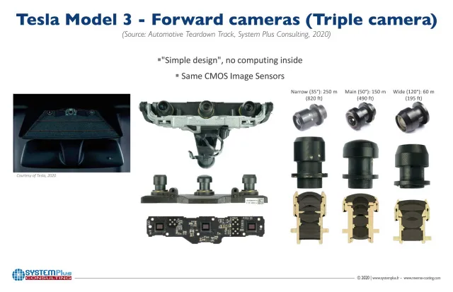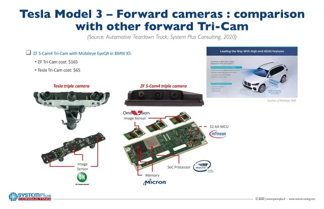 通过从安森美半导体选择成熟的图像传感器,并且不添加任何后处理,特斯拉使相机模块“不是关于拥有最新的图像传感器,而是全部与成本有关”,System Plus 观察到。该公司估计,采埃孚的三相机成本为 165 美元,而特斯拉的三相机成本为 65 美元。