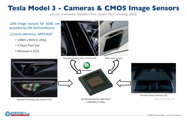 Tesla Model 3 的三重前进相机具有三个 ON Semi AR0136A 的 CMOS 图像传感器,像素尺寸为 3.75 um,分辨率为 1280×960 1.2Mp。它提供了一个长达 250 米的前置图像捕获系统,供 Tesla Model 3 驾驶员辅助自动驾驶仪控制模块单元使用。