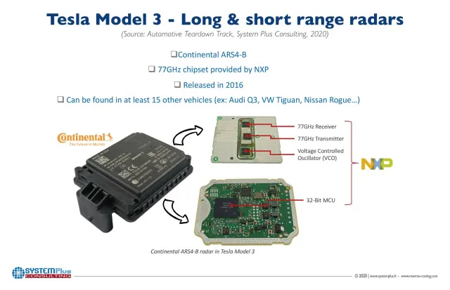 特斯拉选择使用大陆集团成熟的雷达模块。美国大陆航空的 ARS4-B 内部装有一个 NXP 半导体提供的 77GHz 雷达芯片组和 32 位 MCU。System Plus 的 Fraux 指出,尽管包括联发科和德州仪器在内的数家芯片公司声称已进入汽车雷达市场,但恩智浦和英飞凌是无可争议的两大巨头。大陆集团是雷达模块供应商中的关键角色。Fraux 解释说:“它的 ARS4-B 至少还可以找到 15 辆其他车辆,包括 Audio Q3,大众 Tiguan,日产 Rogue 等。”