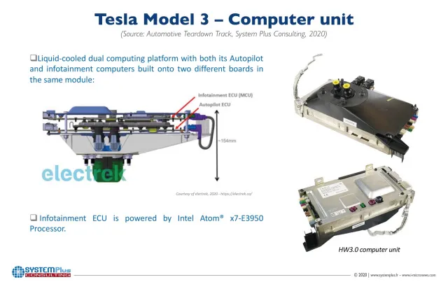 特斯拉开发了一个自定义的“液冷双计算平台”,其中包括其自动驾驶仪和信息计算机。System Plus 的首席执行官 Fraux 解释说,它们被构建在同一模块的两个不同板上。