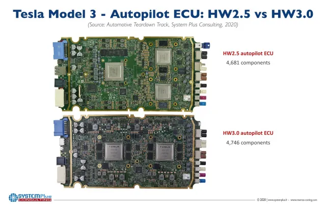 Fraux 表示,特斯拉在相同尺寸的板上塞满了更多用于 HW3 的组件(4746 个组件),而 HW2.5(4681 个组件)对于 HW3,处理器数量从四个 Tesla SoC 减少到了两个(英伟达,英飞凌)。