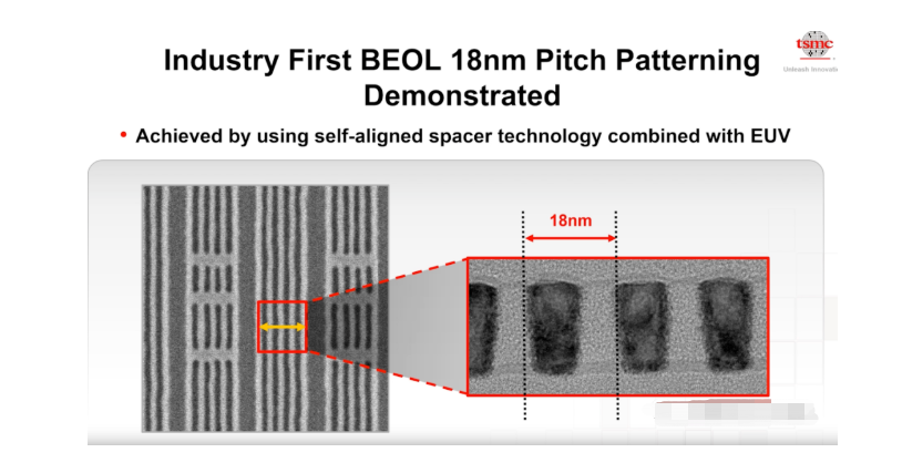 其次是台积电形成的长期的技术合作产业链。ASML 作为早期和台积电建立合作的光刻机供应商,在为台积电提供设备的同时,也得到来自台积电的技术反馈。目前,台积电在在 EUV 光刻技术的 OPC、光罩和光阻等多个方面都有投入,比如台积电在 EUV 技术结合上,采用自对准垫片获得了业内最小的 18nm 的 mental pitch,对晶体管微缩大有帮助。