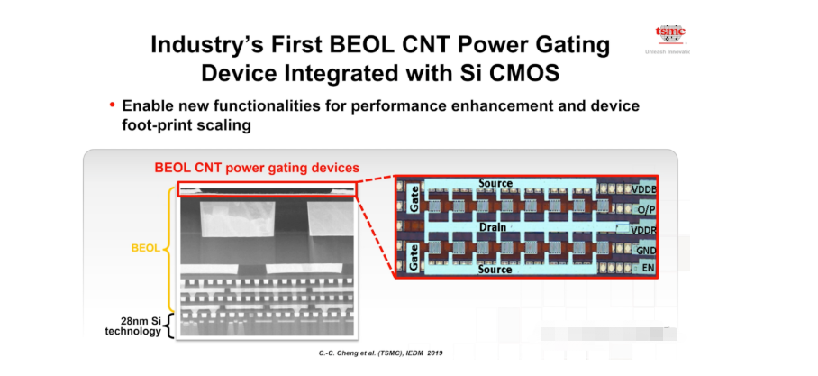 首先是其长期投入获得领先的技术研发优势。比如,为配合新制程工艺的良率,台积电在 Nano-Sheet 结构上面,已经成功生产出了 32 Mb nano-sheet 的 SRAM,在低电压功耗上面具有明显优势;在 2D 材料上,台积电基于包括硫化钼和硫化钨在内的的 2D 硫化材料获得性能非常高的 On-current;在电源管理上,台积电的研究人员用碳纳米管嵌入到一个 CMOS 的设计中,用来替代 Power Gating 的控制电流作用,给未来的进一步微缩提供新的思路。