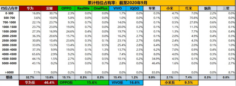 根据知乎大神 @安乎都护府长史 给出的数据显示,截至2020年9月份,华为系的累计占有率46.4%,在卖掉荣耀之后,理想状态下,华为的市场占有率大约会在30%~35%之间,考虑到华为自身海思麒麟芯片数量有限、相关供应商未拿到供货许可,使得华为在国内手机市场举步维艰,预计市场占有率,在明年会跌破30%,这就给了排在第二位的vivo一个登顶国内手机市场的机会。