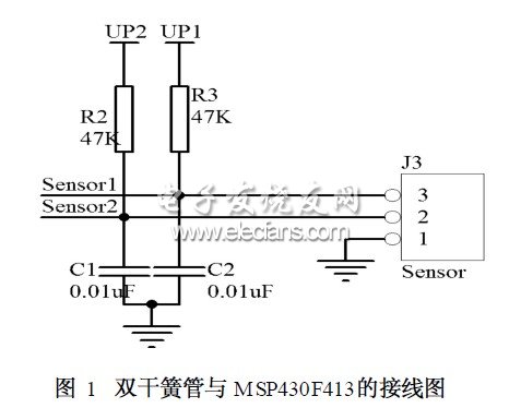 本设计使用了双干簧管传感器,即当检测到一个干簧管吸合时,先记录下来,再检测另一个干簧管,只有检测到另一个干簧管吸合后才认为信号有效。接线图如图1所示。