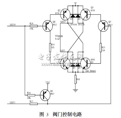 本设计采用小功率电机通过减速,直接驱动球阀开闭。其优点是结构相对简单,水阻小。缺点是球阀的球环加工精度要求高,使用一段时间后由于水垢或微颗粒等使转动阻力增大,设计中采用每月定时开关阀门几次来解决这一问题。阀门控制电路如图3所示。