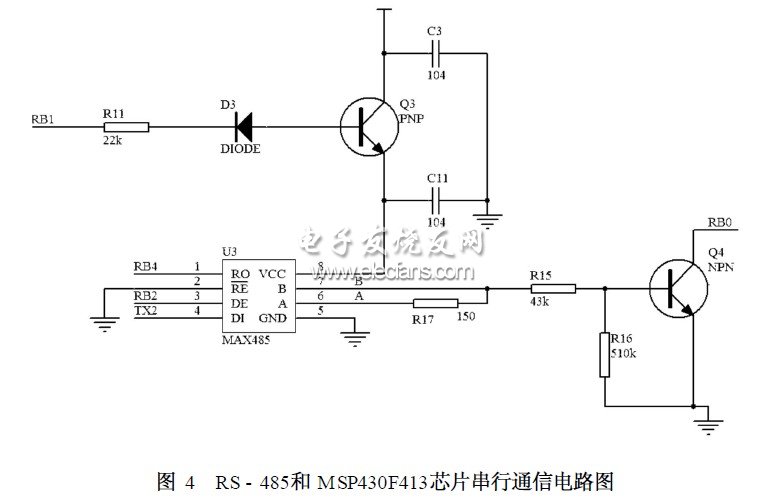 2)下行通信接口电路:用来和智能网络水表进行通信,采用RS-485总线传输方式,如图5(b)所示。使用MAX485芯片和智能网络水表进行通信。